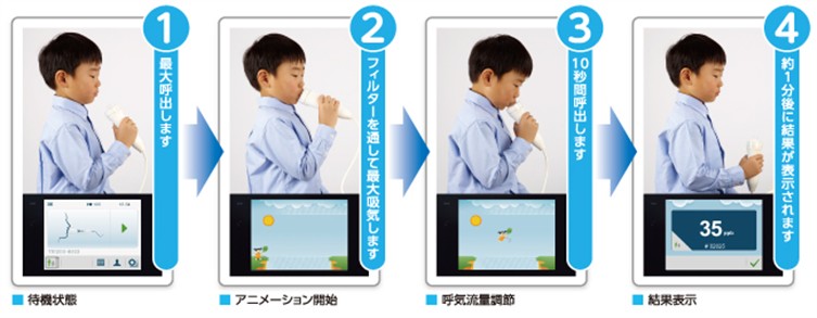 喘息では空気の通り道である気道にアレルギー性の炎症がおきており、呼気中のNO(一酸化窒素)が上昇することがわかっています。検査はとても簡単でアニメーションを見ながら、数秒間息を吹き続けることで測定完了です。